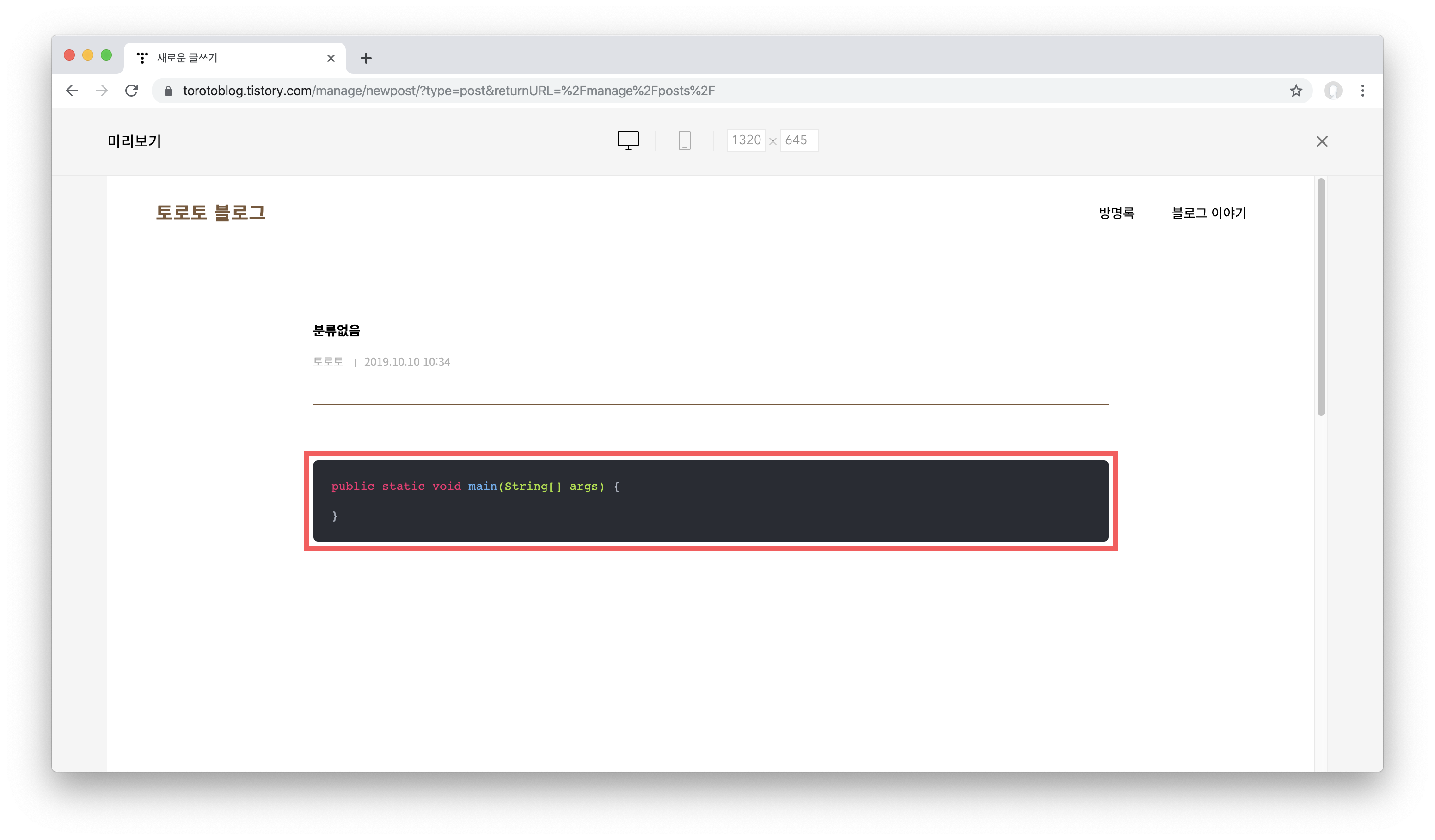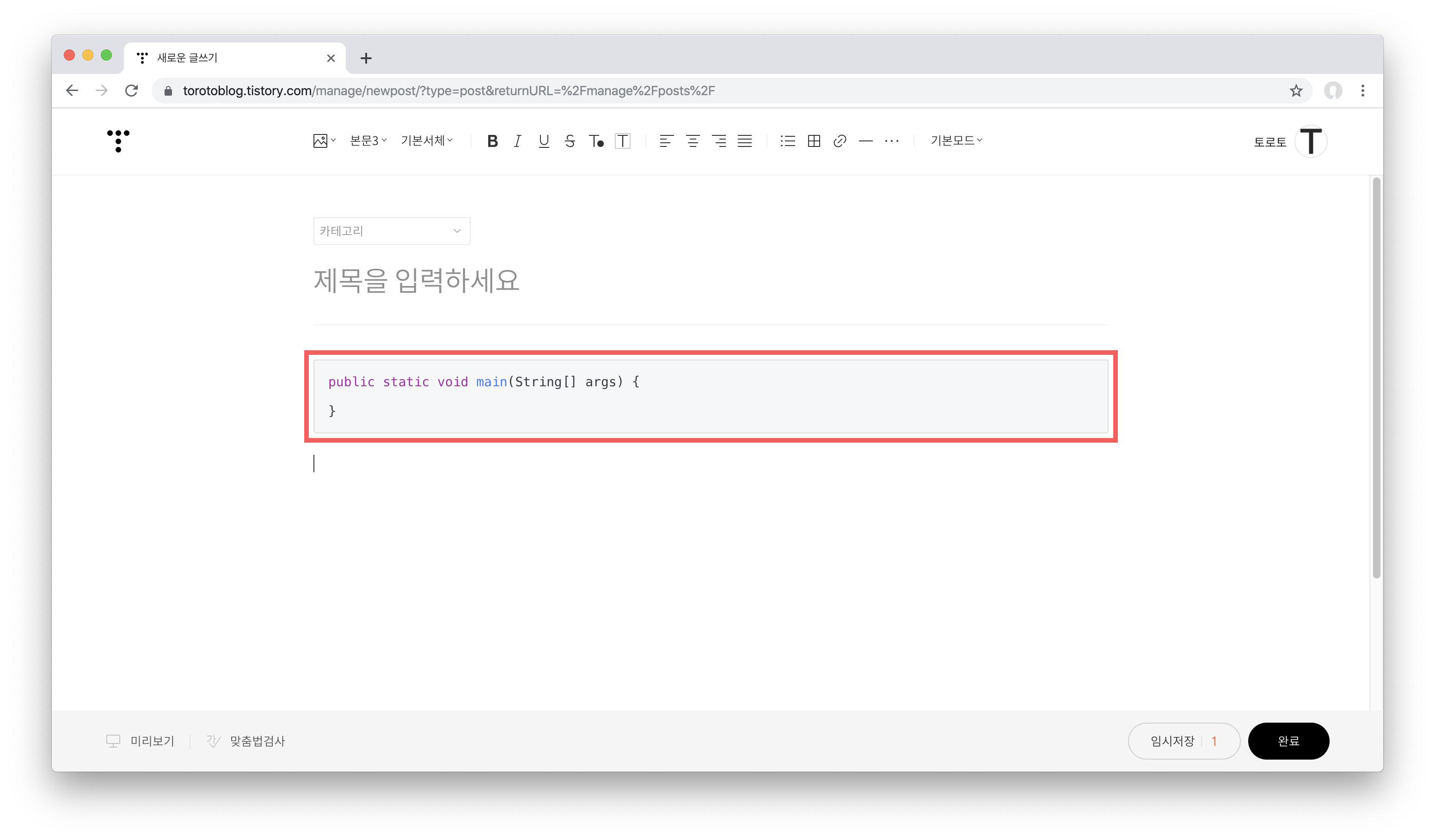 그럼 위 사진처럼 코드 블록이 삽입된 것을 보실 수 있습니다. 여기서 단점이 하나 더 있는데요, 지금 보이는 코드 블록은 그냥 기본 테마입니다. 제가 지금 선택한 테마가 아니죠. 글을 발행하거나 미리보기로 보지 않는 이상 적용된 테마를 보기 어렵습니다.