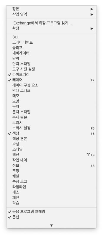 위에 소개한 4가지 요소가 아니더라도 더 다양한 요소들로 포토샵을 구성할 수 있습니다. 상단 메뉴 > 창으로 들어가시면 여러 요소들을 찾을 수 있으니 필요한 게 있다면 여기서 선택하시면 됩니다.