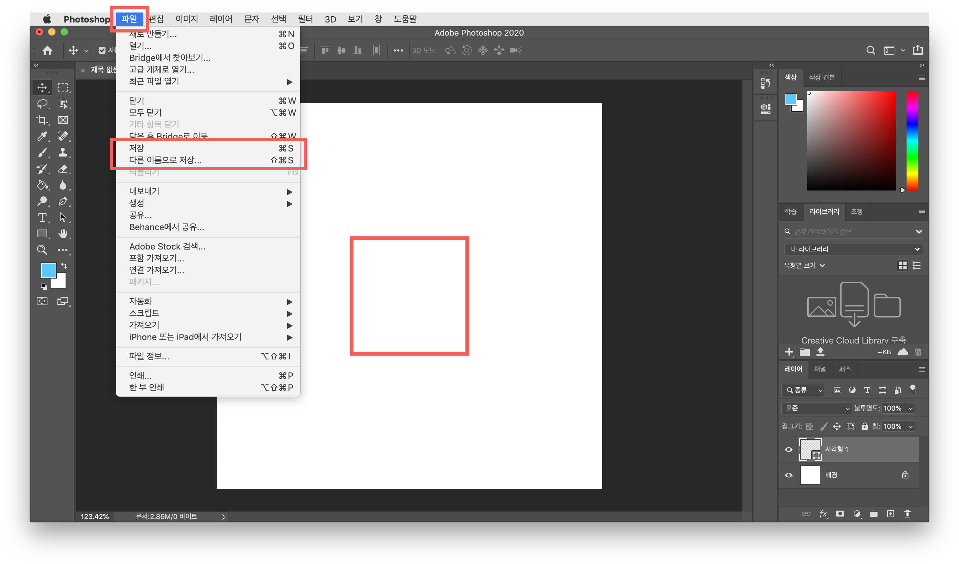 일단 일반 저장을 살펴봅시다. 상단 메뉴에서 파일 > 저장(File > Save) 혹은 파일 > 다른 이름으로 저장(File > Save as...) 둘 중 하나를 선택하시면 됩니다. 둘의 차이를 설명하자면 다른 이름으로 저장은 매번 새로운 파일로 저장을 하지만 저장은(제일 처음을 재외 하고) 한 번 저장을 하고 나면 계속 그 파일 위에 덮어 씌우게 됩니다.