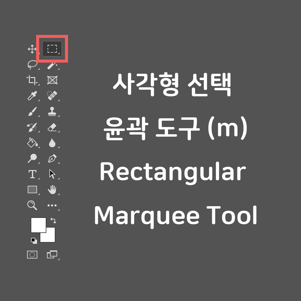 사각형 윤곽 선택 도구(Rectangular Marquee Tool)는 사각형 형태로 영역을 선택할 수 있게 해 주는 도구입니다. 특정 영역만 옮기기 위해 선택을 해야 할 때 주로 사용하는 도구입니다. 기본 단축키는 M 키입니다.