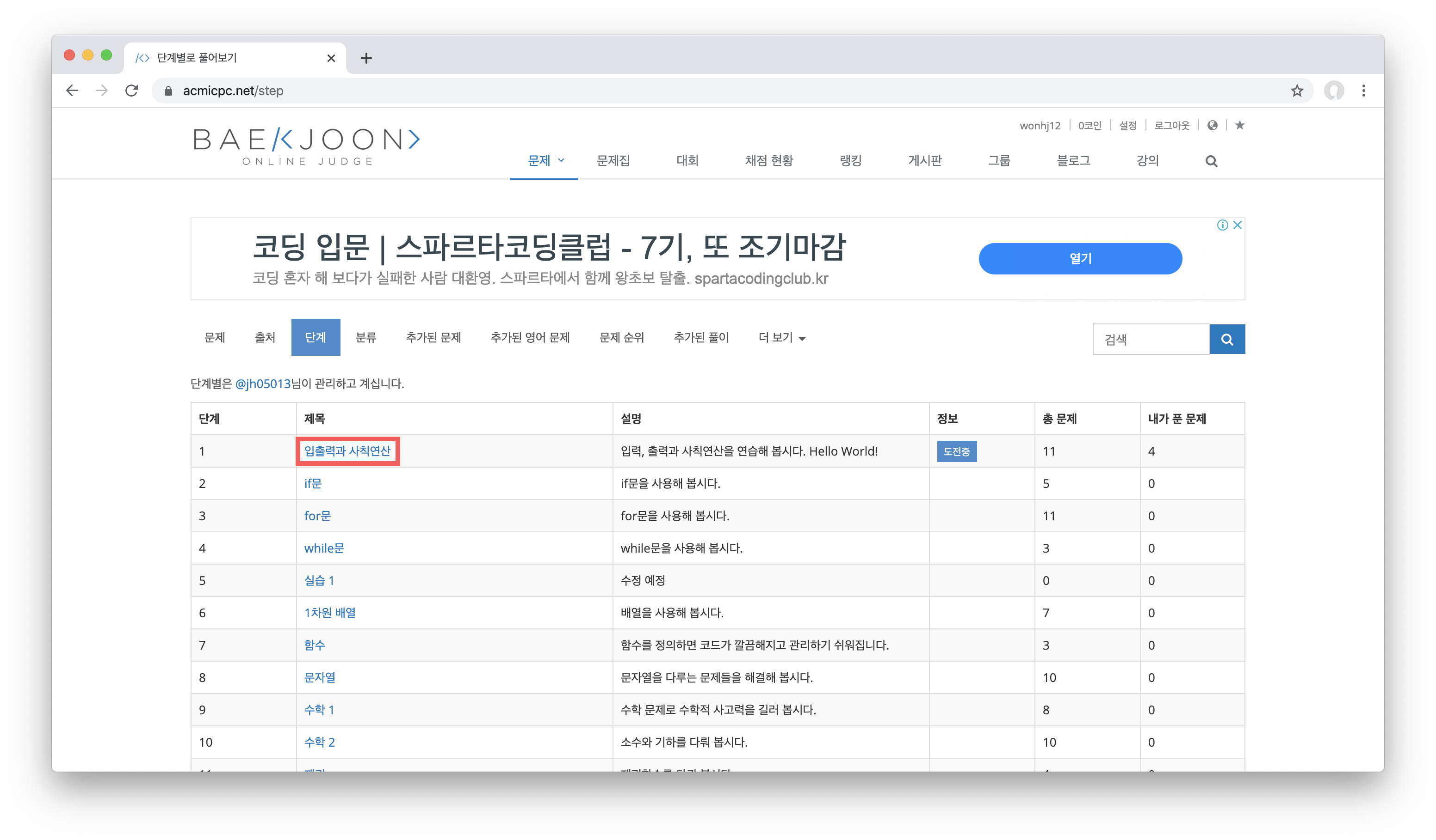 1 단계는 입출력과 사칙연산입니다. 총 11개의 예제 문제들이 있네요. 하나씩 파헤쳐 봅시다.