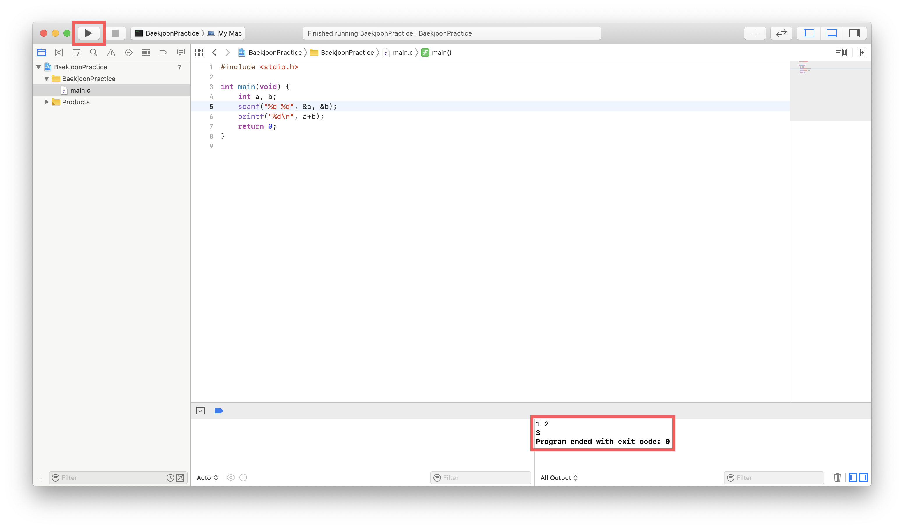 못 보던 코드들이 몇 개 생겼죠? int와 scanf인데요, int는 변수, scanf는 서식을 입력받는 함수입니다.