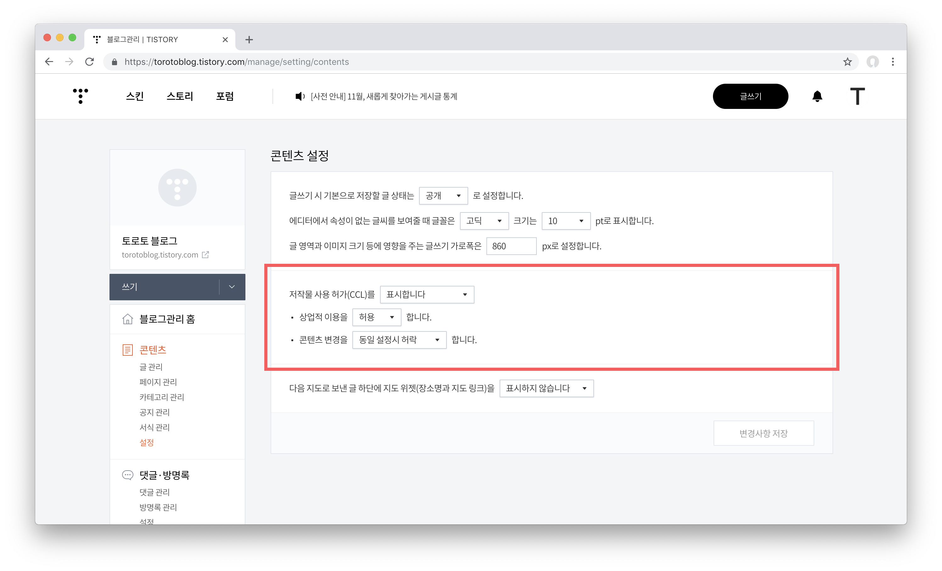 티스토리에서 크리에이티브 커먼즈 라이선스를 적용하는 방법은 간단합니다. 블로그 관리 페이지에서 콘텐츠 > 설정 메뉴로 들어가 줍시다.