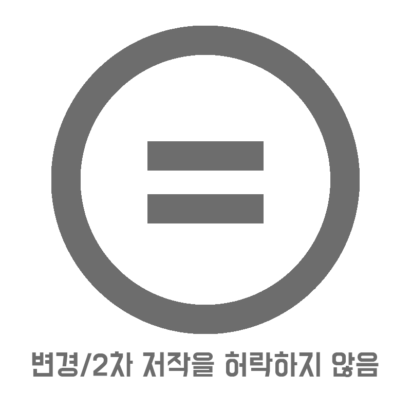 그다음은 변경과 2차 저작을 허락하지 않음입니다. "동일하다"라는 뜻을 가진 "=" 아이콘에서 알 수 있듯이 복사를 할 수는 있지만, 원작과 동일해야 한다는 것을 알 수 있습니다. 물론, 글을 이용해서 비슷한 글을 작성하는 2차 저작 또한 허락되지 않습니다.