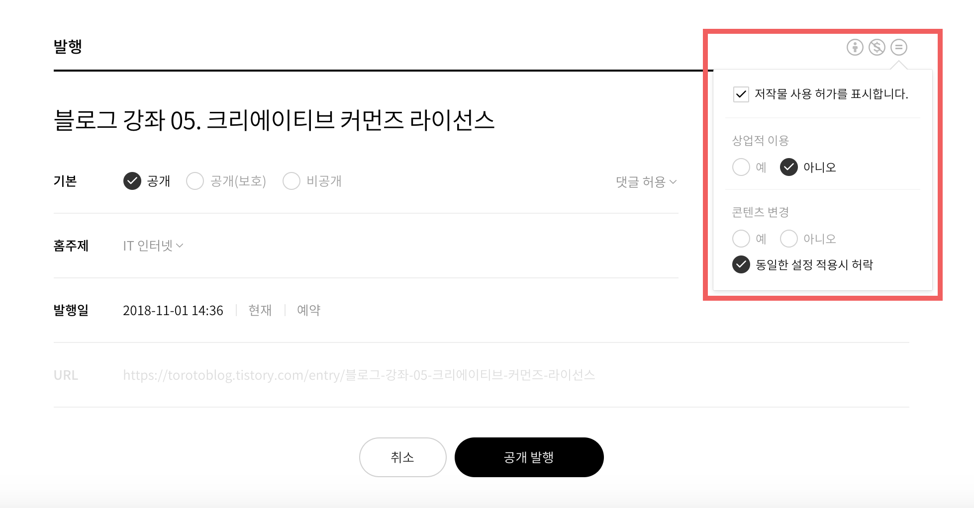새로 변경된 에디터에서는 글을 발행하기 전 우측 상단을 보면 CCL 표시가 있네요.