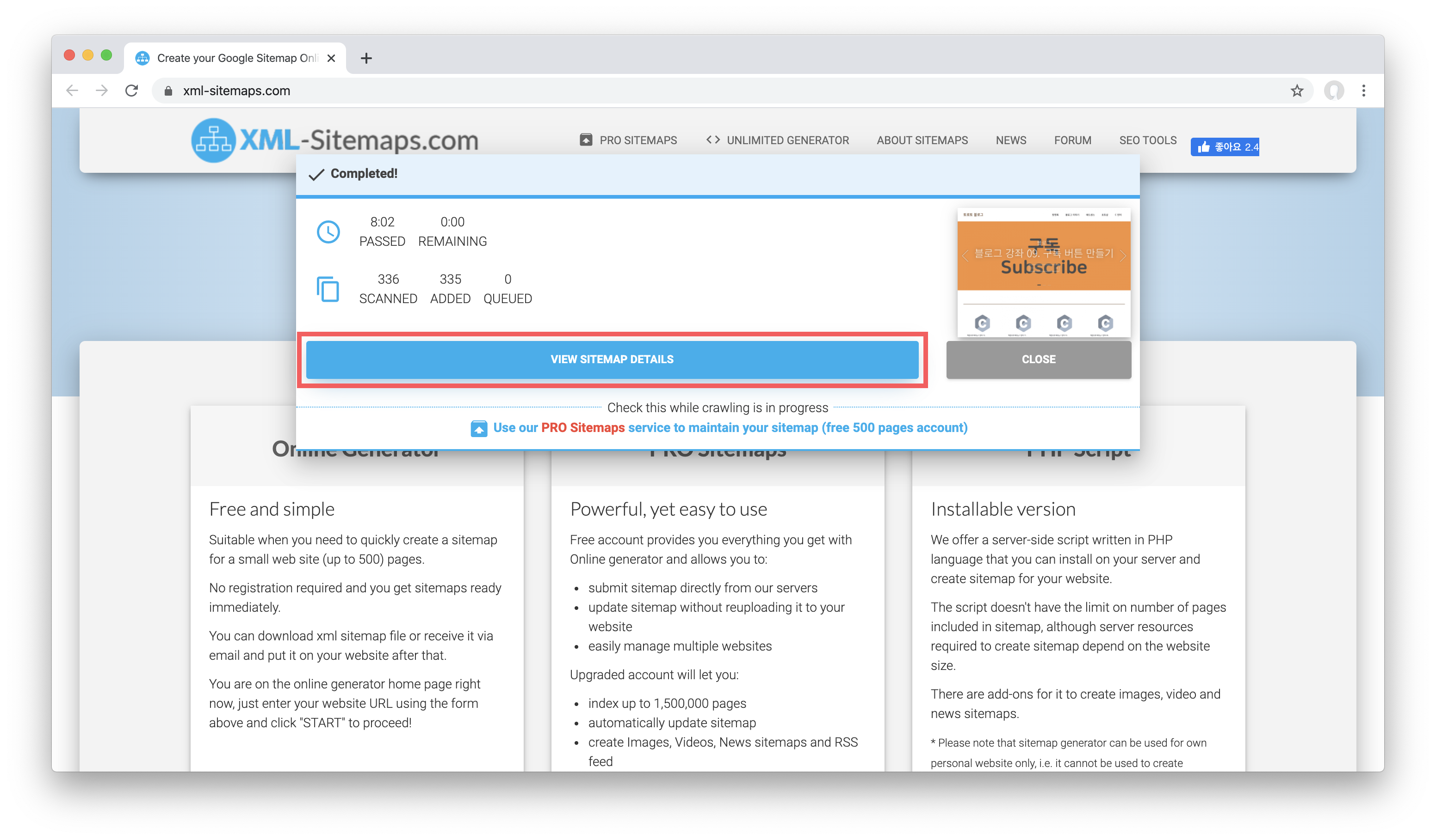 생성이 완료되면 VIEW SITEMAP DETAILS 버튼을 클릭해 주세요.