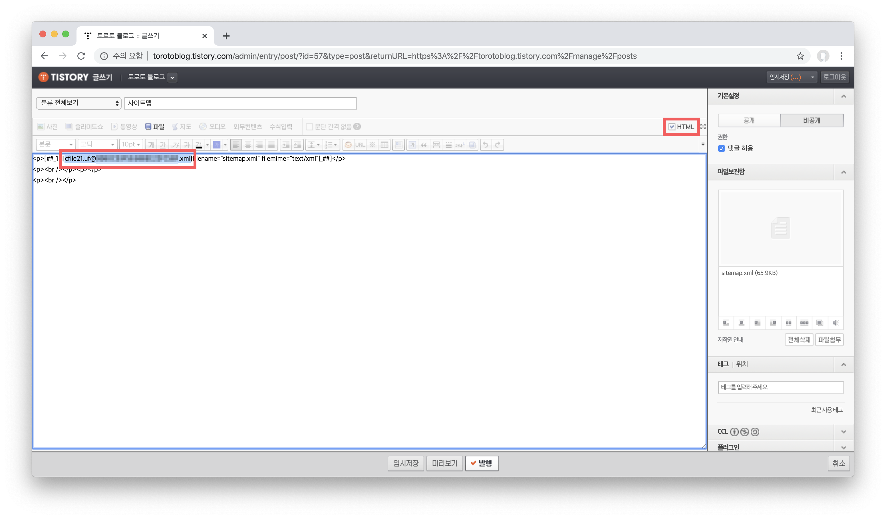업로드를 한 뒤 에디터 우측 상단을 보시면 HTML 메뉴가 있는데요, 이걸 클릭해서 첨부파일의 경로를 확인해 봅시다. cfile로 시작하는 부분이 있을 건데요,. xml까지 cfile21.uf@xxxxxxxx.xml이 부분을 전부 복사해 줍시다. 그다음 글을 발행하시면 되는데요, 비공개로 발행하는 걸 추천드립니다.
