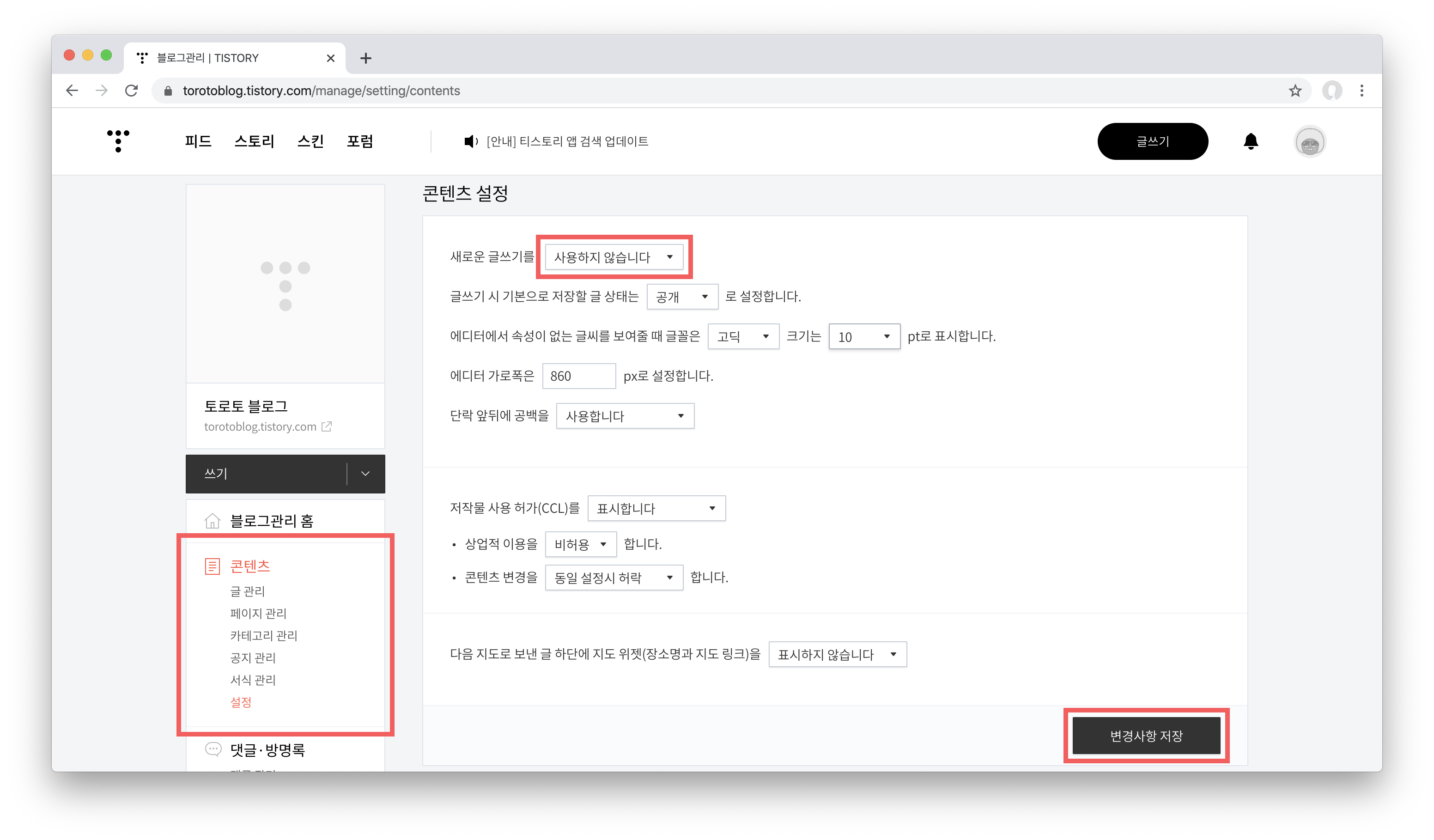 사이트맵 수정이 끝났다면 이제 블로그에 업로드를 해 봅시다. 다만 티스토리 새 에디터는 첨부파일 형식이 조금 달라져서 구 에디터를 사용해야 하는데요, 관리자 페이지로 들어간 뒤 콘텐츠 > 설정 메뉴에 들어가서 새로운 글쓰기를 사용하지 않습니다로 선택해 주시면 됩니다. 설정을 바꾸셨다면 변경사항 저장 버튼을 클릭해서 적용시켜 주시고요.