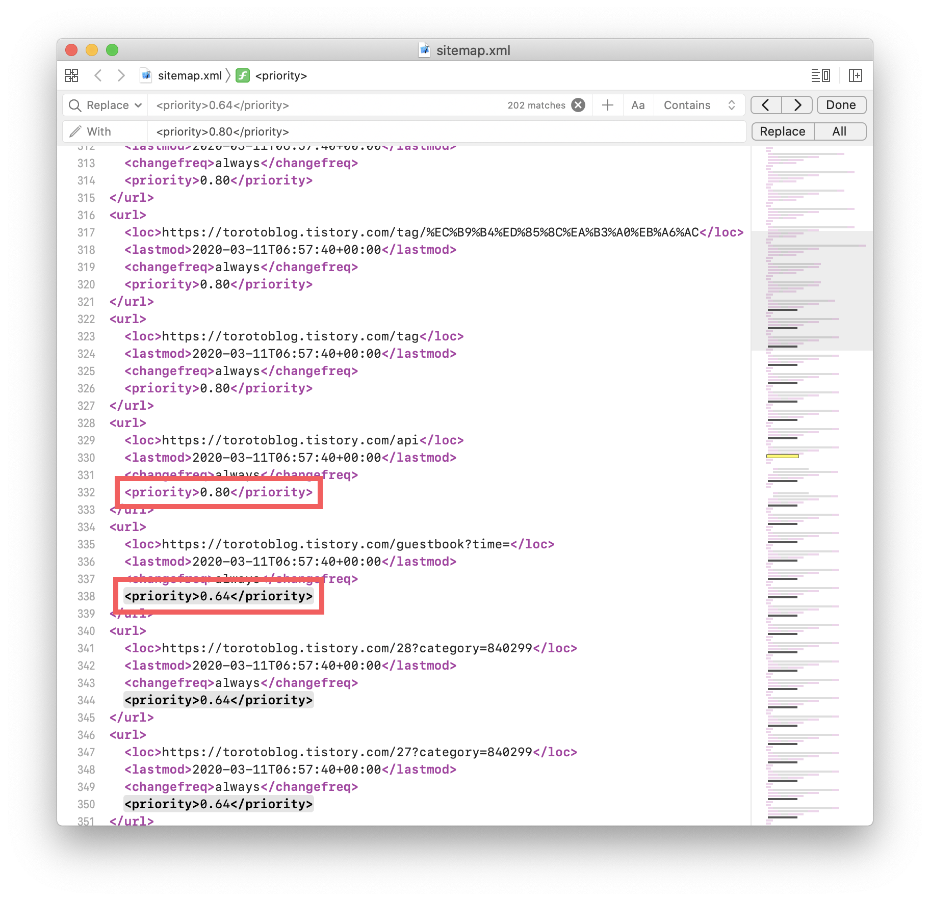 위 사진처럼 어떤 페이지들은 0.8, 어떤 페이지는 0.64 이런 식으로 다양한데요(블로그마다 값들이 조금씩 다를 수 있습니다), 저는 제일 위에 있는 메인 주소(torotoblog.tistory.com)를 제외하고는 다 통일되게 0.8로 설정해 줄 겁니다. 일일이 바꿔도 되지만 검색을 해서 한 번에 전부 다 바꾸는 걸 추천드려요.