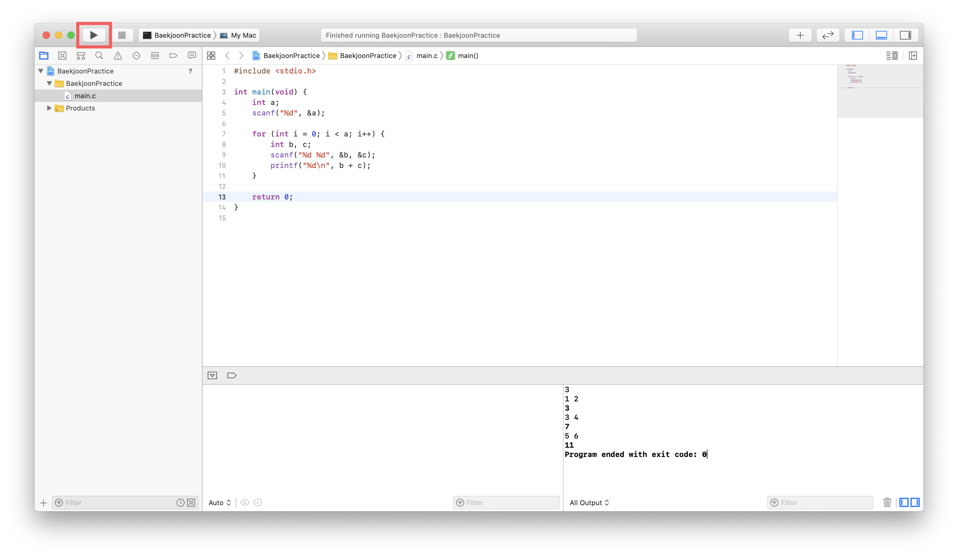 이제는 다 익숙한 코드들이죠? 맨 처음 숫자를 입력받은 뒤 그 숫자만큼 입력, 출력을 해야 하기 때문에 일단은 평소 하던 것처럼 숫자 하나를 입력받습니다. 이 입력받은 숫자를 for 문의 조건식에 대입해서 사용하면 그 숫자만큼만 반복하게 되죠. 그러면 문제에서 요구한 것처럼 케이스의 개수만큼 A와 B를 받아서 합을 출력할 수 있게 됩니다. 별로 어려운 문제는 아니였네요.