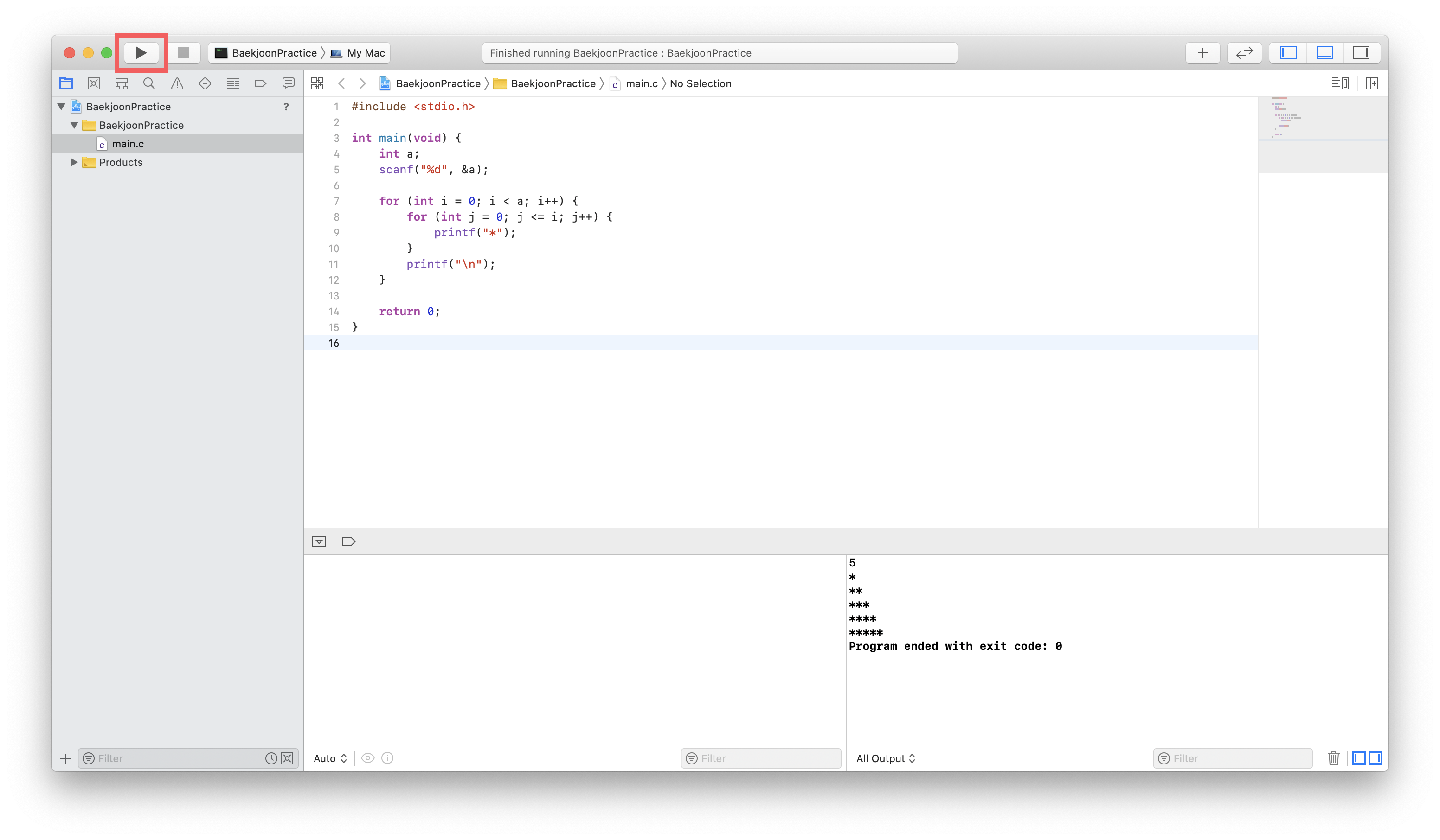 테스트를 해 볼까요? 빌드를 한 뒤 숫자를 입력해 넣으면 별이 차례대로 프린트됩니다. 잘 작동하네요!