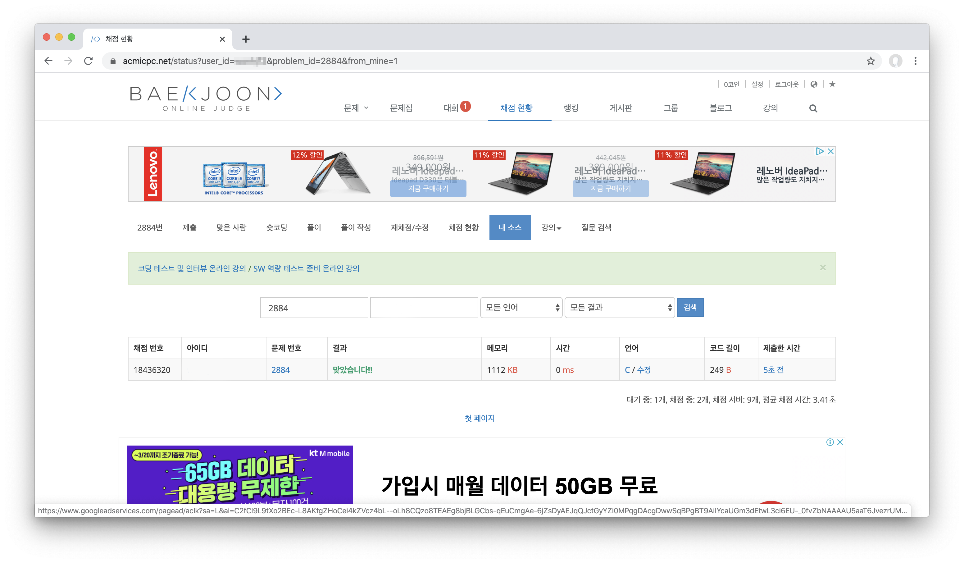 이제 제출을 합시다. 백준에서 언어를 C로 설정하고 제출을 하시면 됩니다.
