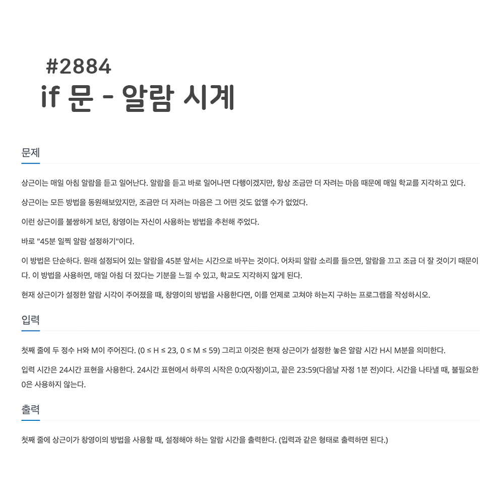 알람 시계(#2884) 문제는 입력된 시간에서 45분을 빼야 하는 문제입니다. 다만 시간은 60분 단위로 되어있기 때문에 일반적인 뺄셈 문제와는 조금 다르죠. 이 문제를 푸는 방법은 여러 가지가 있는데요, 제 생각에는 나눗셈과 나머지를 이용하는 게 제일 간단한 방법인 것 같더라고요. 코드를 살펴봅시다.