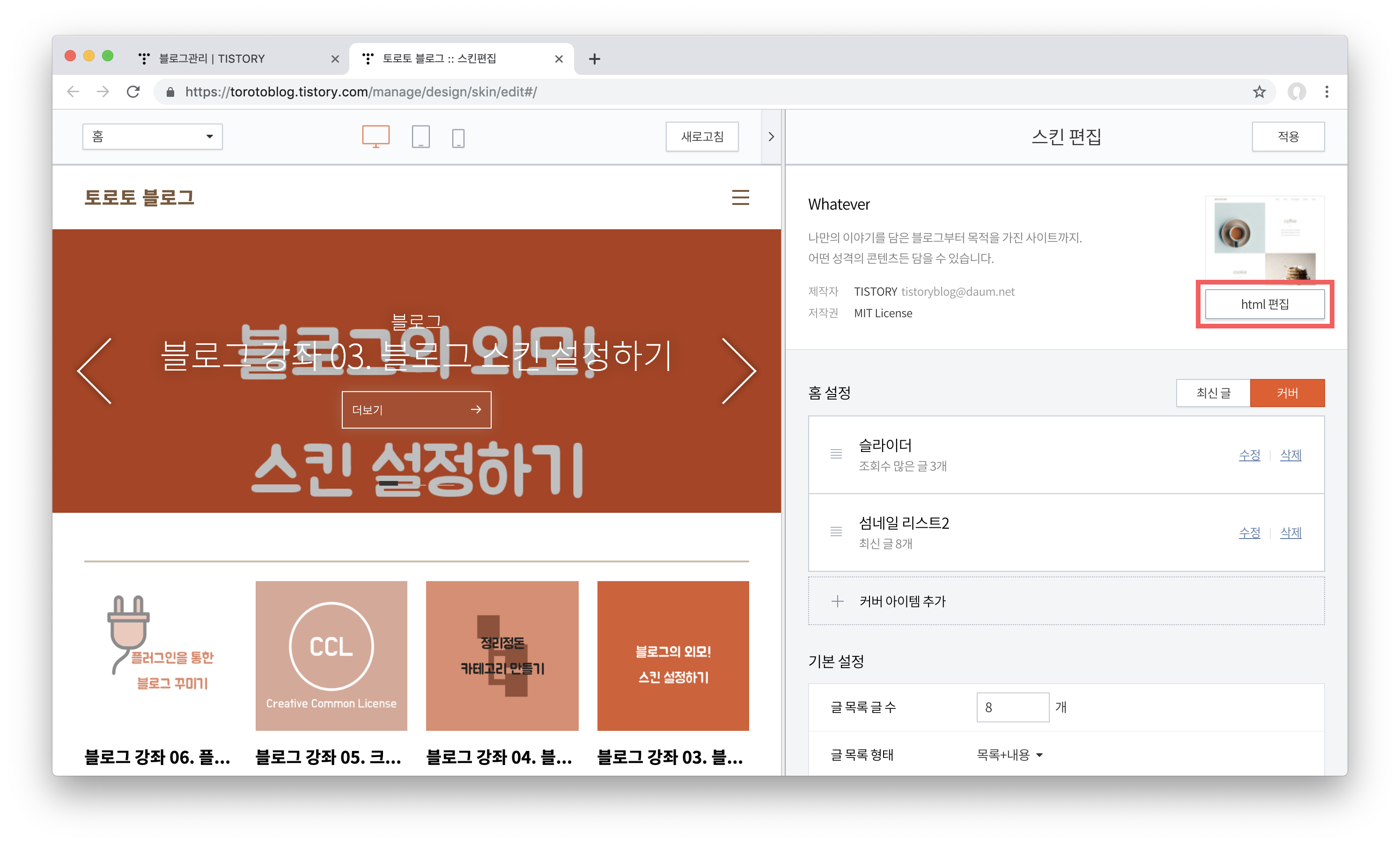 스킨을 편집할 수 있는 페이지가 열리는데요, 우측 상단에 있는 html 편집 버튼을 클릭해 주세요.