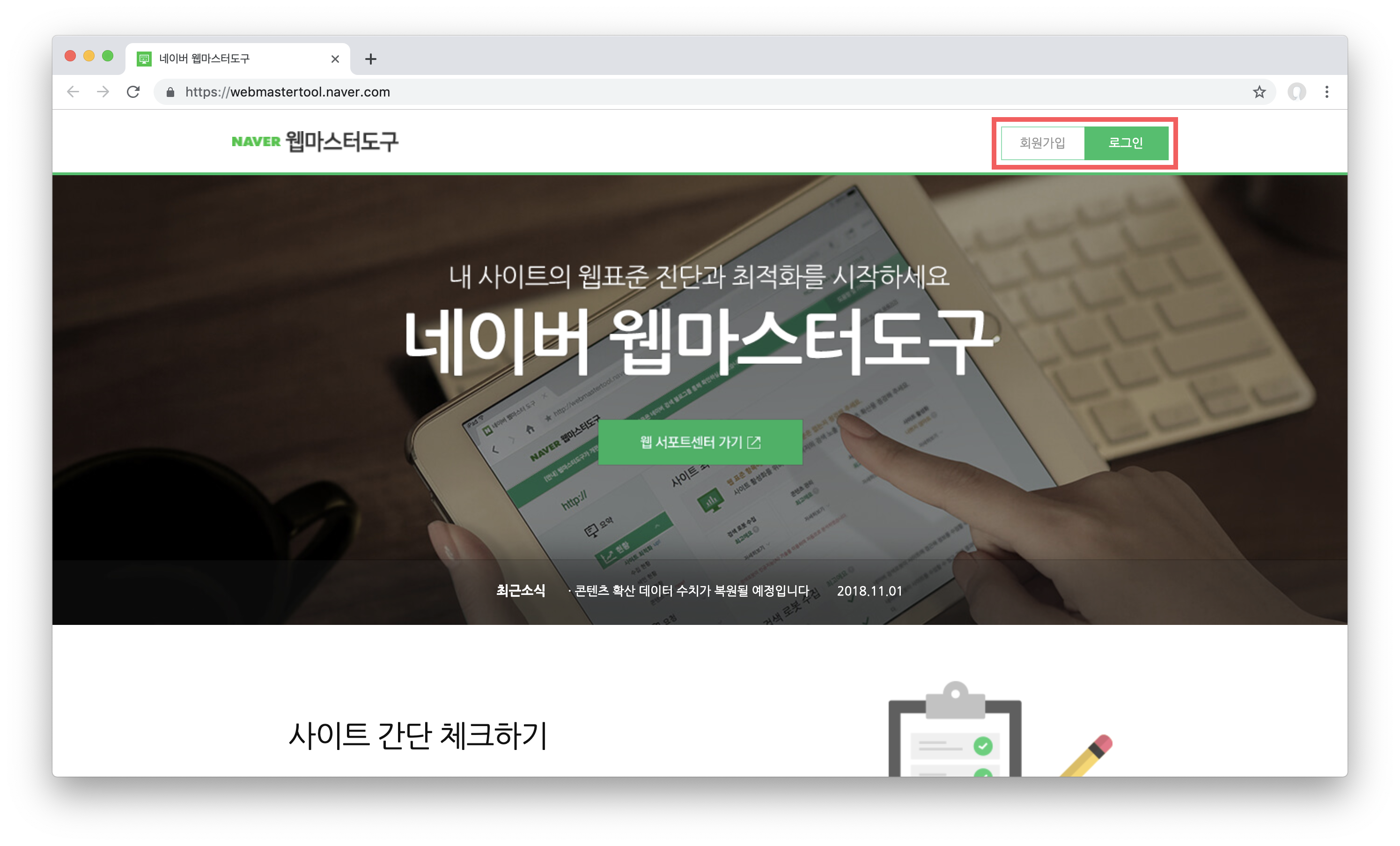 네이버에 검색 등록을 시키기 위해서는 네이버 웹마스터도구에 블로그를 등록시키면 됩니다. 네이버 웹마스터도구 https://webmastertool.naver.com/ 사이트에 들어간 뒤 우측 상단에 있는 로그인 버튼을 통해서 네이버 아이디로 로그인합시다. 만약 네이버 아이디가 없다면 회원가입을 하시면 됩니다.