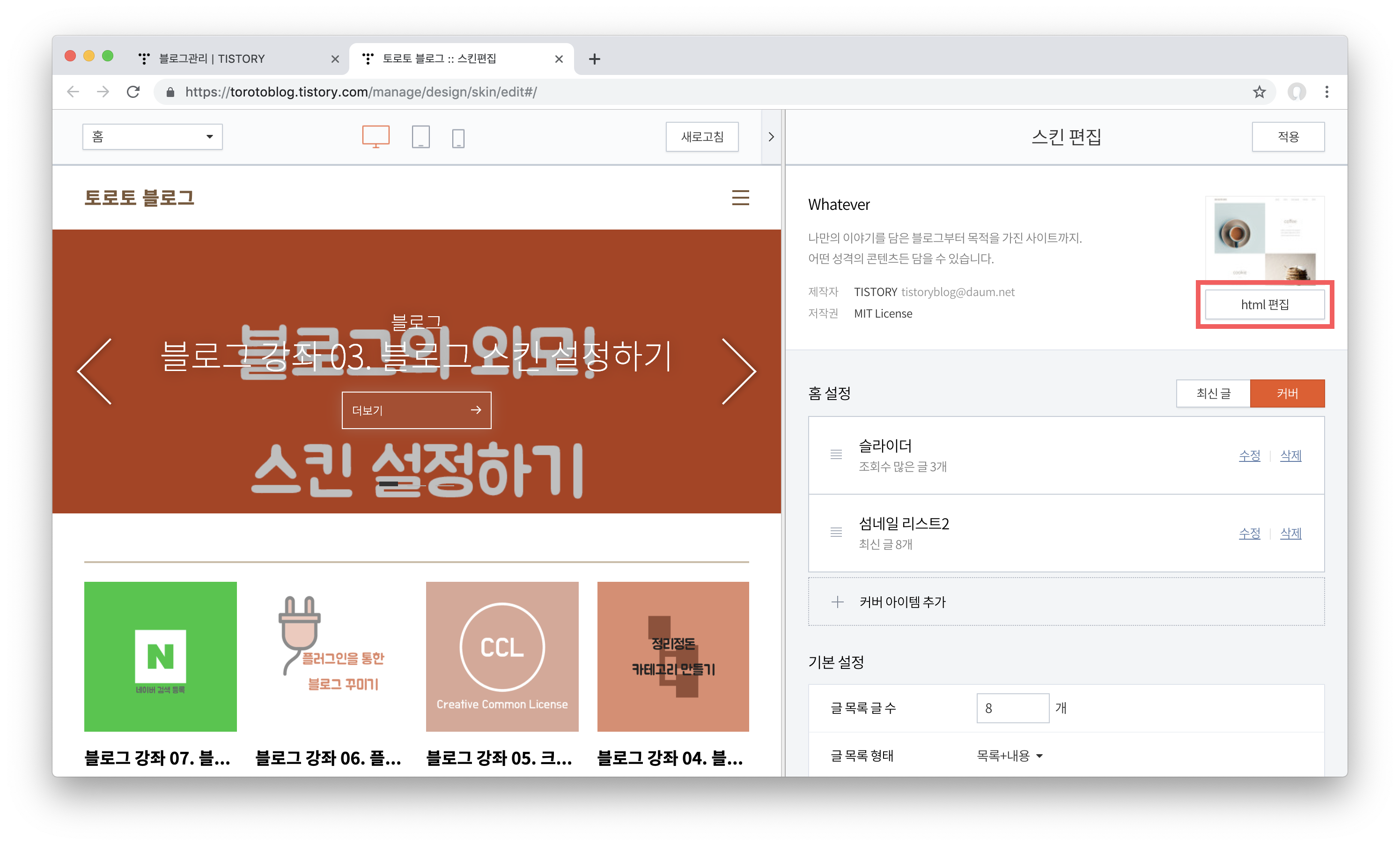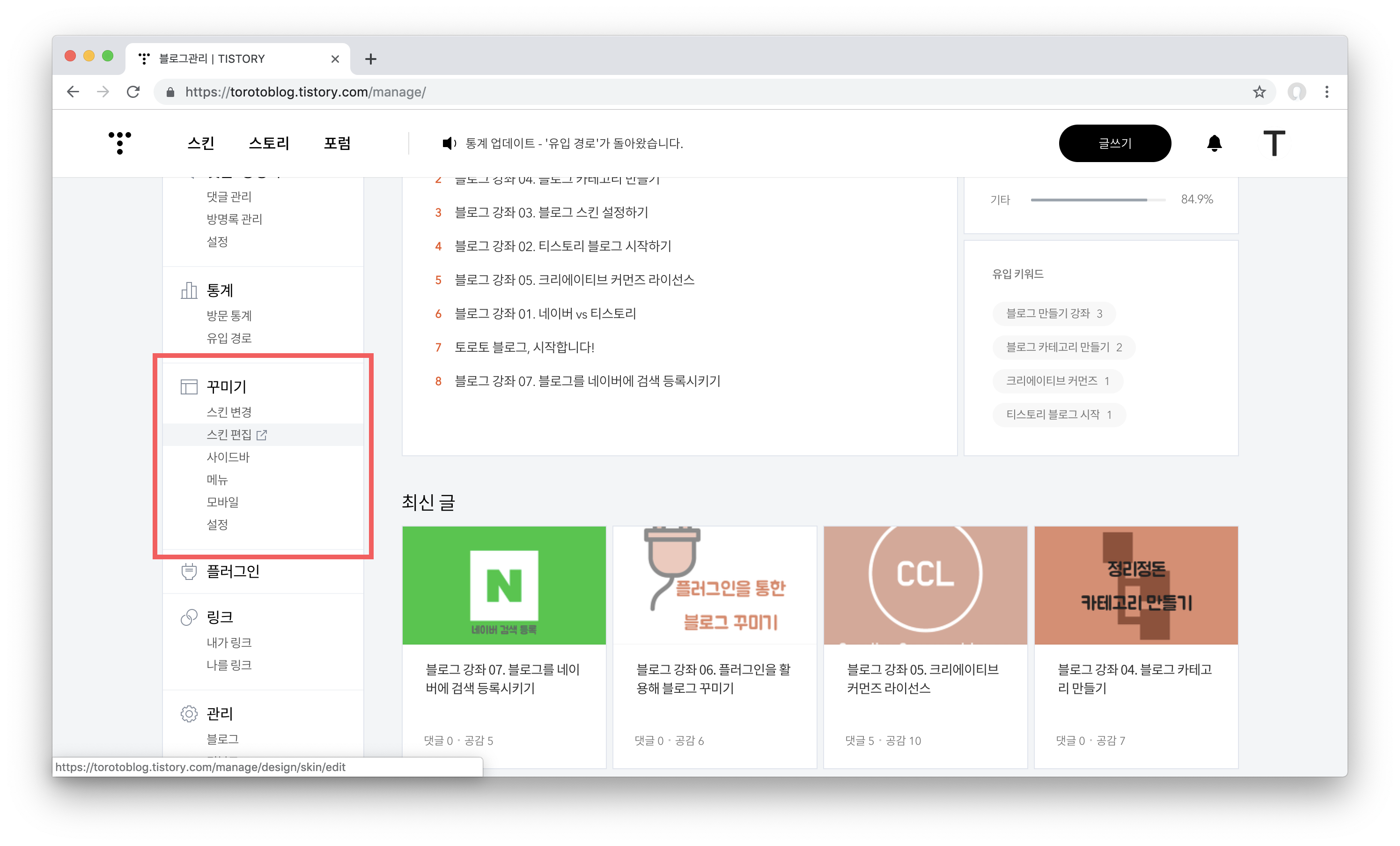 이제 티스토리 블로그 관리자 페이지로 와서 꾸미기 > 스킨 편집 페이지로 들어가 줍시다.