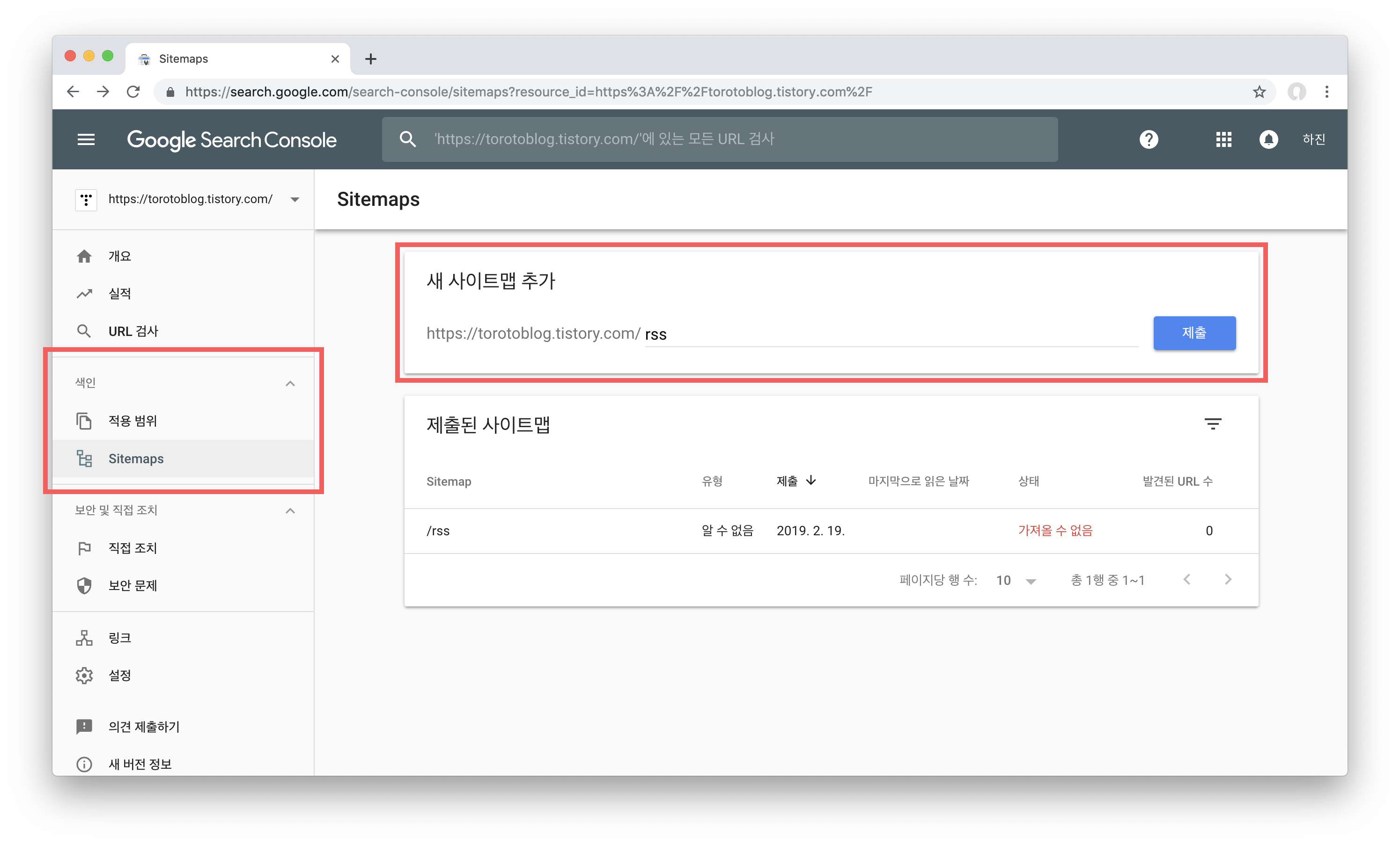 왼쪽 메뉴에서 색인 > Sitemaps로 들어가서 새 사이트맵을 추가해 줍시다. 블로그 주소 끝에 rss라고 입력한 뒤 제출 버튼을 클릭하면 간단하게 rss가 추가됩니다.